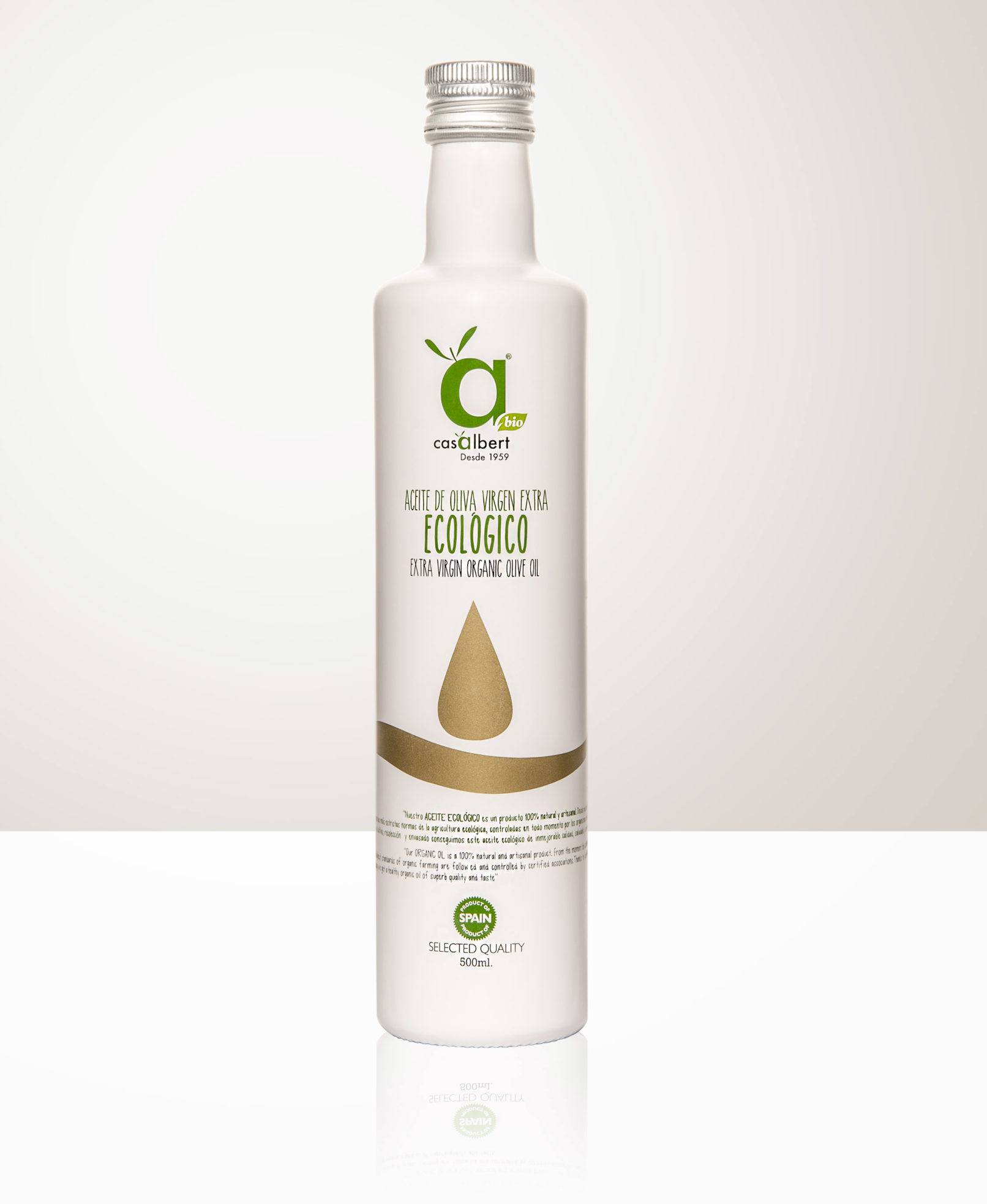 Diseño de botella serigrafiada para el Aceite de Oliva Virgen Extra Ecológico de Aceites Albert.